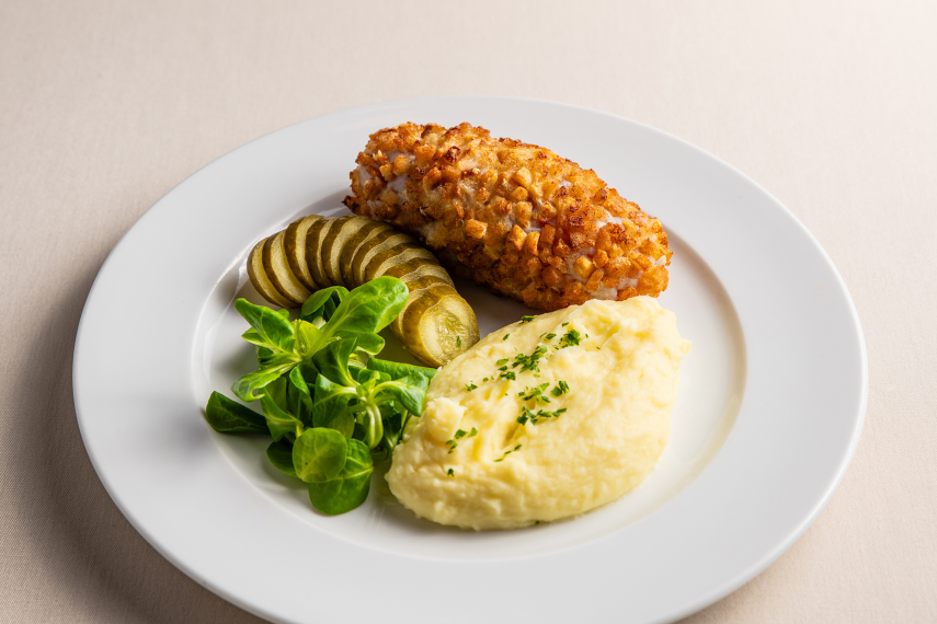 Kraukšķīgā panējumā apcepta ar zaļumiem un sviestu pildīta tītara fileja ar kartupeļu biezeni un marinētiem gurķīšiem