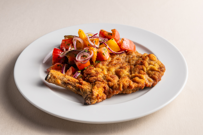 Teļa fileja kraukšķīgā panējumā Milānas gaumē ar tomātu, sarkano sīpolu, olīveļļas un citronu sulas salātiem