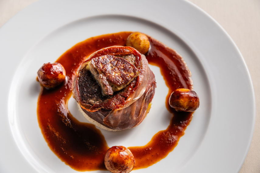 Liellopa filejas steiks ar Parmas šķiņķi, Foie Gras un klasisko demi-glace mērci